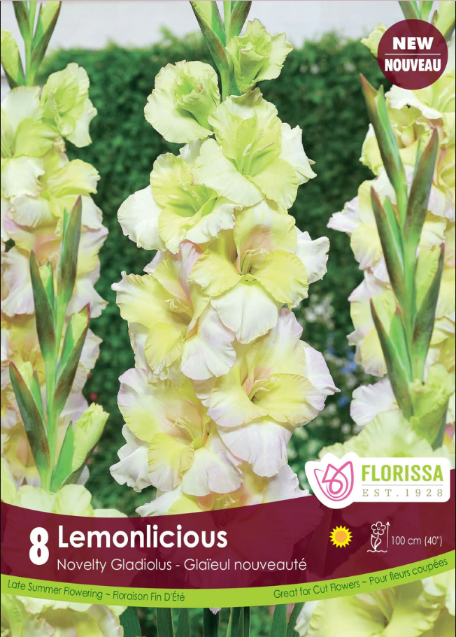 Lemonlicious Large Flowering Gladiolus bulbs. An annual flower in a pale yellow with pink blushing that grows to approximately 100 cm tall (40 inches).